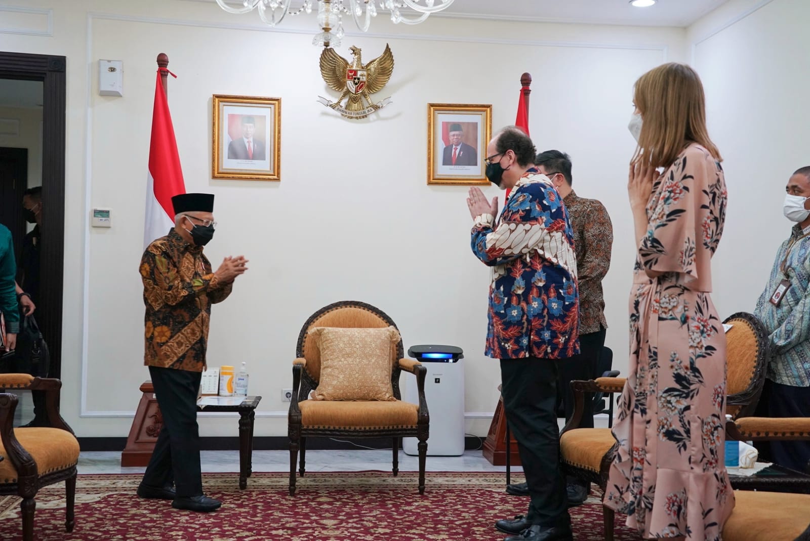 Sementara Wapres didampingi oleh Kepala Sekretariat Wapres Ahmad Erani Yustika, Staf Khusus Wapres Bidang Komunikasi dan Informasi Masduki Baidlowi, Staf Khusus Wapres Bidang Hukum Satya Arinanto, Staf Khusus Wapres Bidang Infrastruktur dan Investasi Sukriansyah S. Latief, Staf Khusus Wapres Bambang Widianto, Plt. Deputi Bidang Dukungan Kebijakan Pemerintahan dan Wawasan Kebangsaan Lukman Hakim Siregar, serta Direktur Eropa I Kementerian Luar Negeri Widya Sadnovic.