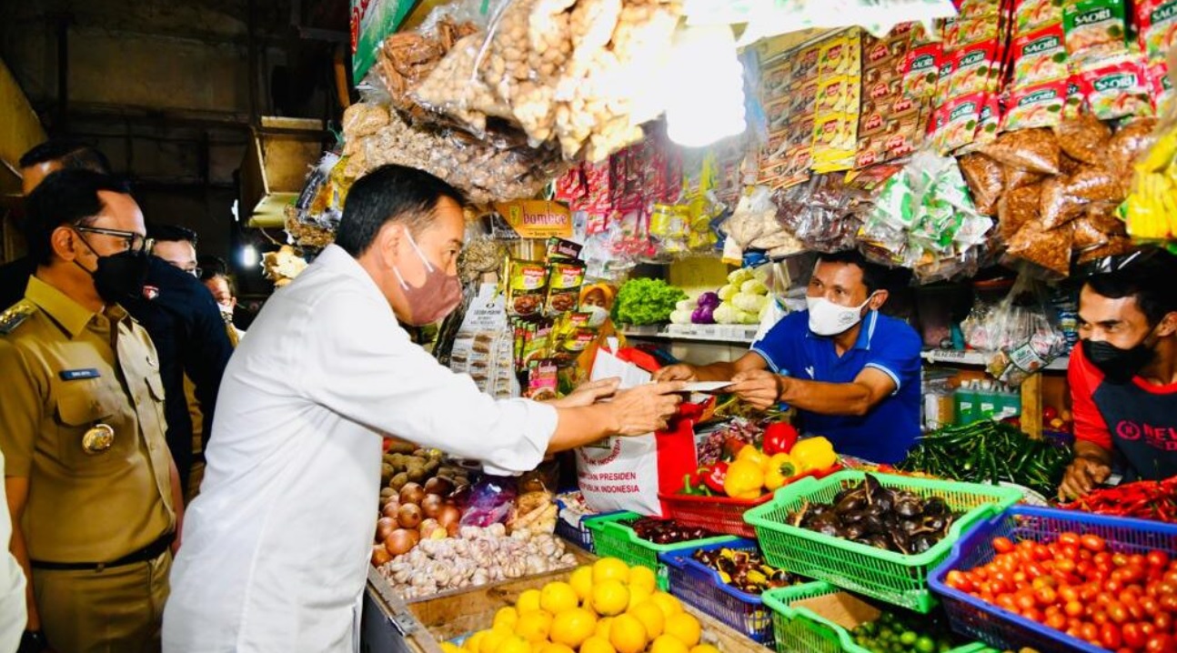 (Vibizmedia-Nasional) Presiden Joko Widodo membagikan bantuan sosial (bansos) bagi penerima manfaat dan pedagang di sejumlah pasar di Kabupaten Bogor dan Kota Bogor pada Kamis, 21 April 2022.
