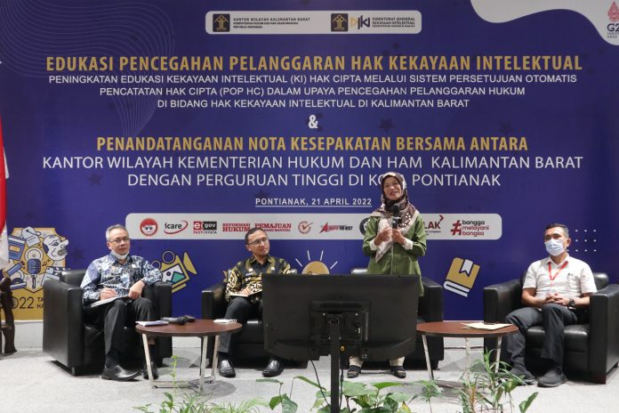 Mengangkat tema Peningkatan Edukasi Kekayaan Intelektual (KI) Hak Cipta Melalui Sistem Persetujuan Otomatis Pencatatan Hak Cipta (POP HC), Dalam Upaya Pencegahan Pelanggaran Hukum di Bidang Hak Kekayaan Intelektual di Kalimantan Barat, kegiatan ini juga dirangkaikan dengan penandatanganan nota kesepakatan bersama antara Kanwil Kemenkumham Kalbar dengan Perguruan Tinggi se-Kota Pontianak tentang Pendidikan Dan Pengajaran, Penelitian Serta Pengabdian Kepada Masyarakat Dalam Bidang Kekayaan Intelektual.
