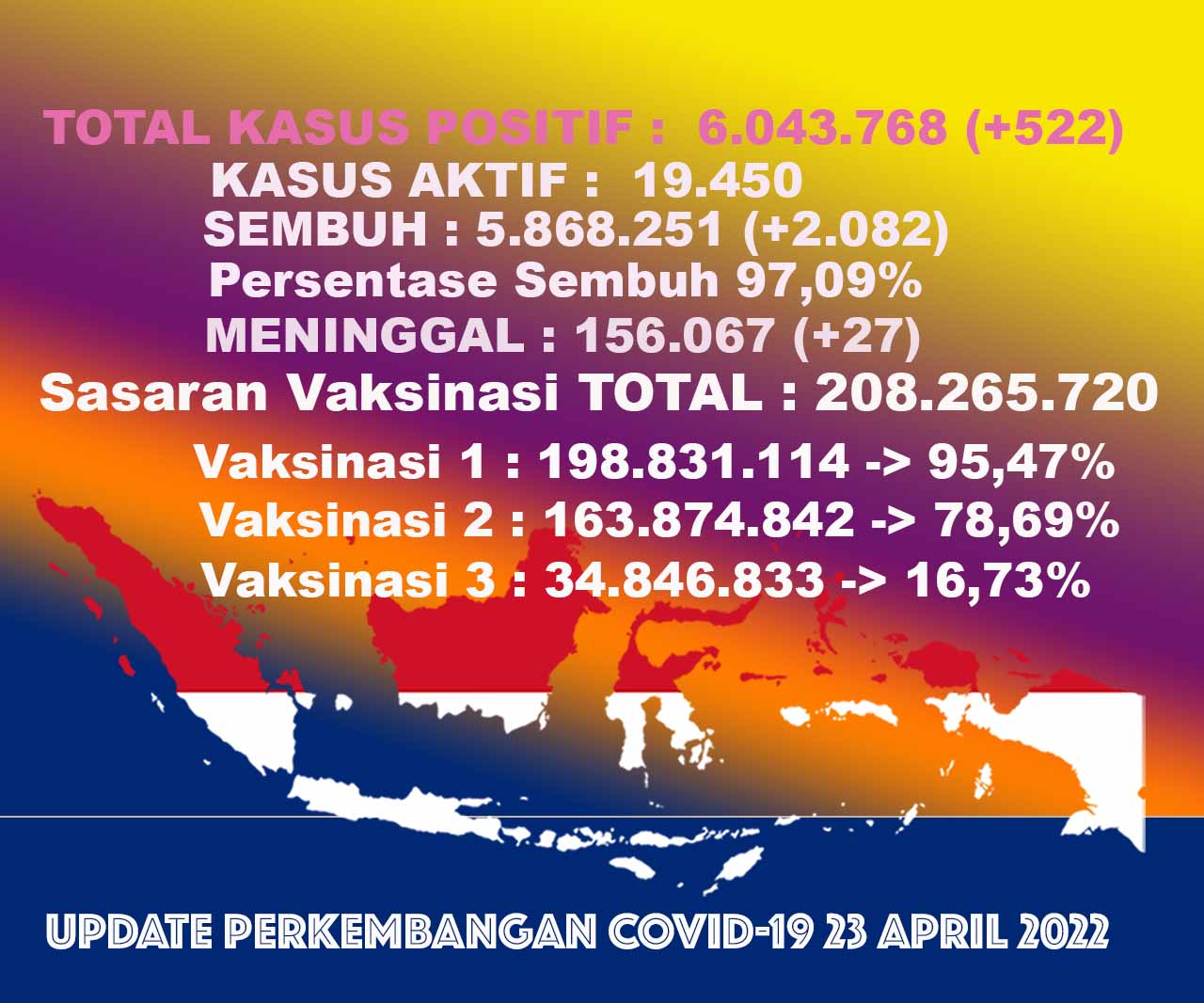 (Vibizmedia – Nasional) Berikut adalah angka akumulatif perkembangan data kasus Covid-19 dari seluruh Indonesia hingga tanggal 23 April 2022.