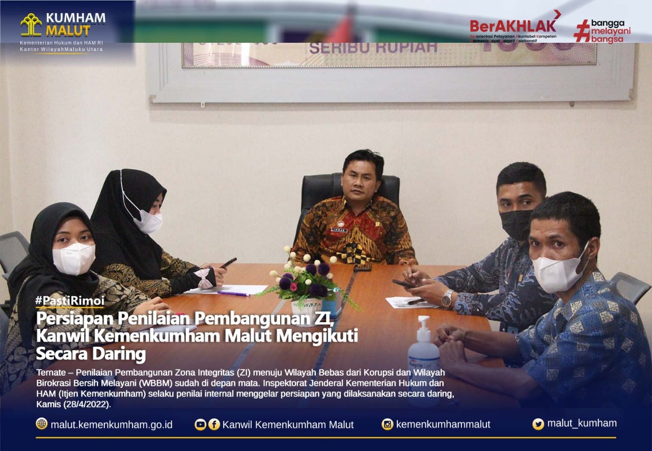 (Vibizmedia – Malut) Ternate, malut.kemenkumham.go.id – Penilaian Pembangunan Zona Integritas (ZI) menuju Wilayah Bebas dari Korupsi dan Wilayah Birokrasi Bersih Melayani (WBBM) sudah di depan mata. Inspektorat Jenderal Kementerian Hukum dan HAM (Itjen Kemenkumham) selaku penilai internal menggelar persiapan yang dilaksanakan secara daring, Kamis (28/4/2022).