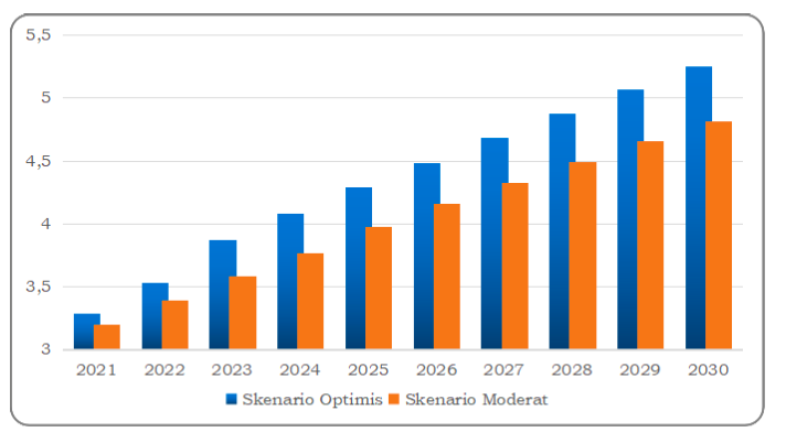 Pandemi Covid-19 yang terjadi pada awal tahun 2020, menyebabkan pertumbuhan ekonomi hingga beberapa tahun kedepan menjadi tertekan. Terdapat dua probability proyeksi pertumbuhan ekonomi, yang akan mendrive demand listrik. Kedua skenario proyeksi demand ditampilkan pada Gambar A1.2 berikut. Pertumbuhan demand rata-rata tahun 2021 s/d 2030 Provinsi Aceh, untuk masing-masing skenario optimis sebesar 5,7%, sedangkan moderat 4,8%.