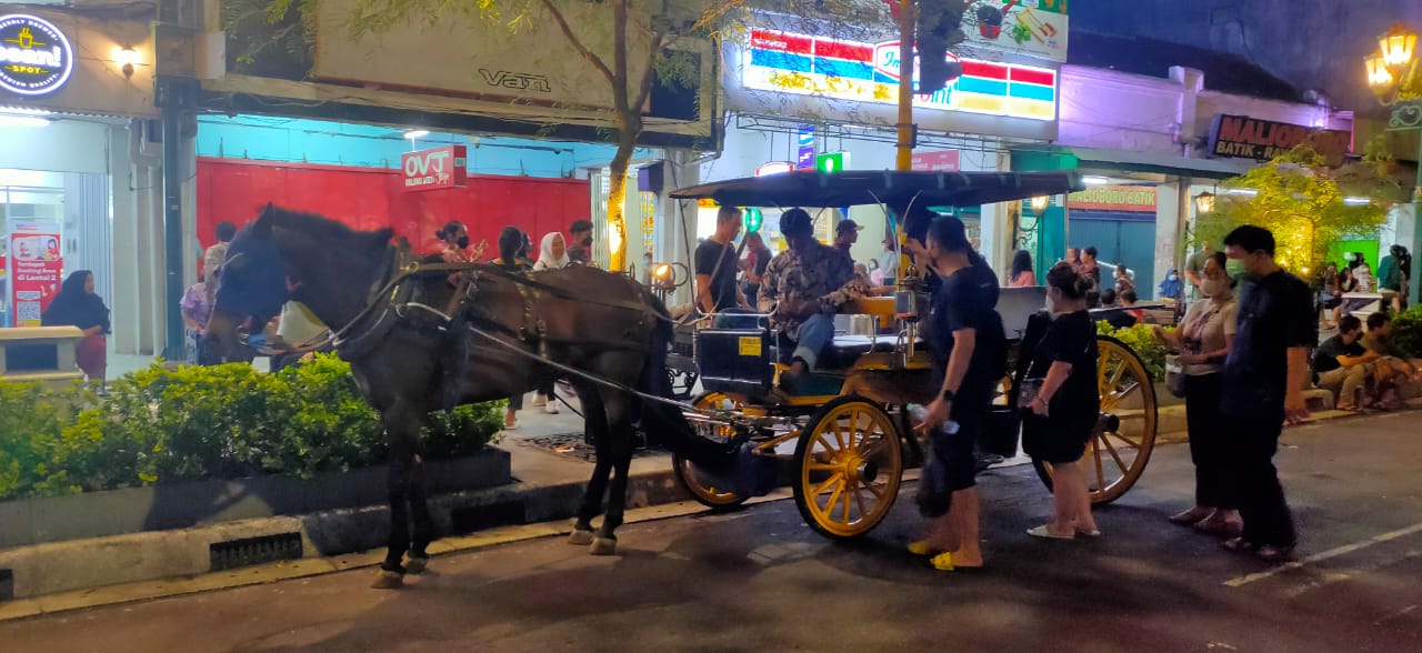 Semakin malam semakin ramai pengunjung yang memadati kawasan Jalan Malioboro yang sempat sepi pada awal masa pandemi Covid-19. Jika Anda ingin mencoba bersantai naik becak, seru juga.