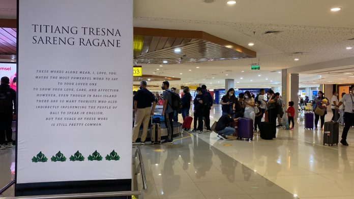 Dengan ramah, manajemen Angkasa Pura I menyambut pendatang sekaligus memperkenalkan bahasa Bali yang umum digunakan dalam percakapan sehari-hari. Yuk, sekalian belajar bahasa Bali.