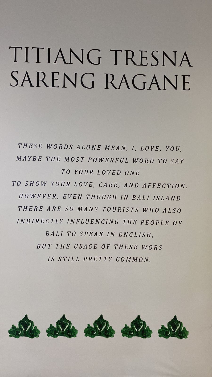 Punapi gatra artinya “apa kabar” atau “how are you” dalam bahasa Bali (Foto: Vera Herlina/ Vibizmedia)Titiang tresna sareng ragane, yang artinya “saya cinta kamu” atau “I love you” (Foto: VeraHerlina/ Vibizmedia)Matur suksma, agak mirip bahasa Jawa, artinya “terima kasih” atau “thank you”. Mudah diingat dan mudah diucapkan (Foto: Vera Herlina/ Vibizmedia)Titiang lungsur mapamit dumun, ucapan santun untuk mengatakan “selamat tinggal, saya akan pergi sekarang” atau dalam bahasa Inggris: “I’m taking leave now” (Foto: Vera Herlina/ Vibizmedia)