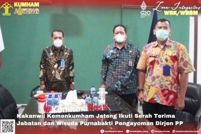 (Vibizmedia – Jateng) SEMARANG – Kepala Kantor Wilayah Kemenkumham Jawa Tengah, A. Yuspahruddin menyaksikan Serah Terima Jabatan dan Wisuda Purnabakti Pengayoman Direktur Jenderal Peraturan Perundang-Undangan secara virtual, Kamis (12/05).