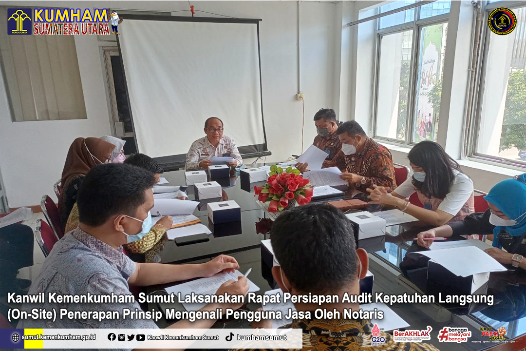 Untuk kelancaran pelaksanaan audit tersebut, Kamis (12/5/2022), bertempat di Ruang Rapat Kepala Divisi Pelayanan Hukum dan HAM,  Kantor Wilayah Kementerian Hukum dan HAM Sumatera Utara (KUSUMA) sebagai pembina notaris di seluruh Wilayah Sumatera Utara yang dipimpin langsung oleh Kepala Divisi Pelayanan Hukum dan HAM ( Alex Cosmas Pinem) melaksanakan  Rapat Persiapan dengan Ketua dan Sekretaris Majelis Pengawas Daerah (MPD) Notaris Provinsi Sumatera Utara guna membahas langkah-langkah terkait pengawasan kepatuhan terhadap Notaris dalam penerapan PMPJ agar terwujud keseragaman.