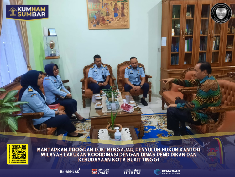 (Vibizmedia – Sumbar) Bukittinggi – Penyuluh Hukum Kantor Wilayah Kementerian Hukum dan HAM Sumatera Barat melakukan koordinasi dengan Kepala Dinas Pendidikan dan Kebudayaan Kota Bukittinggi, Drs. Melfi Abra, M.Si dalam rangka memantapkan Program DJKI Mengajar pada Kamis (12/05).