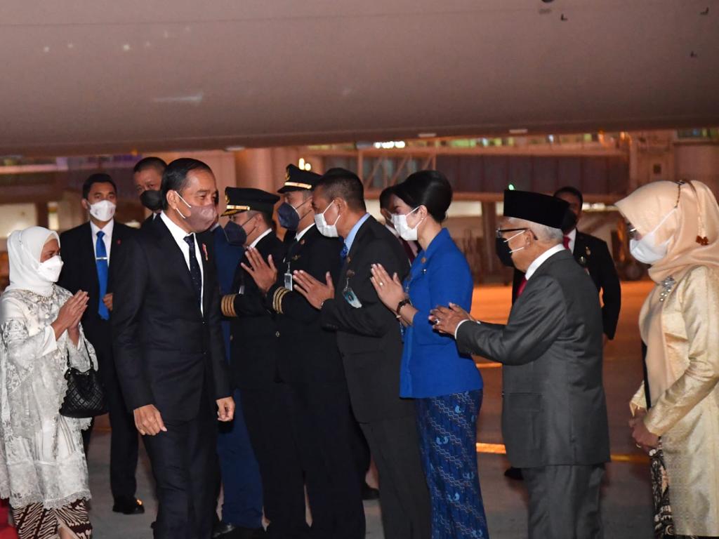 Setibanya di Bandara, Presiden Jokowi dan Ibu Iriana tampak disambut oleh Wakil Presiden Ma’ruf Amin beserta Ibu Wury Ma’ruf Amin, Sekretaris Kabinet Pramono Anung, Panglima TNI Jenderal Andika Perkasa, Kapolri Jenderal Pol. Listyo Sigit Prabowo, Pj. Gubernur Banten Almuktabar, dan Direktur Utama Garuda Indonesia Irfan Setiaputra.