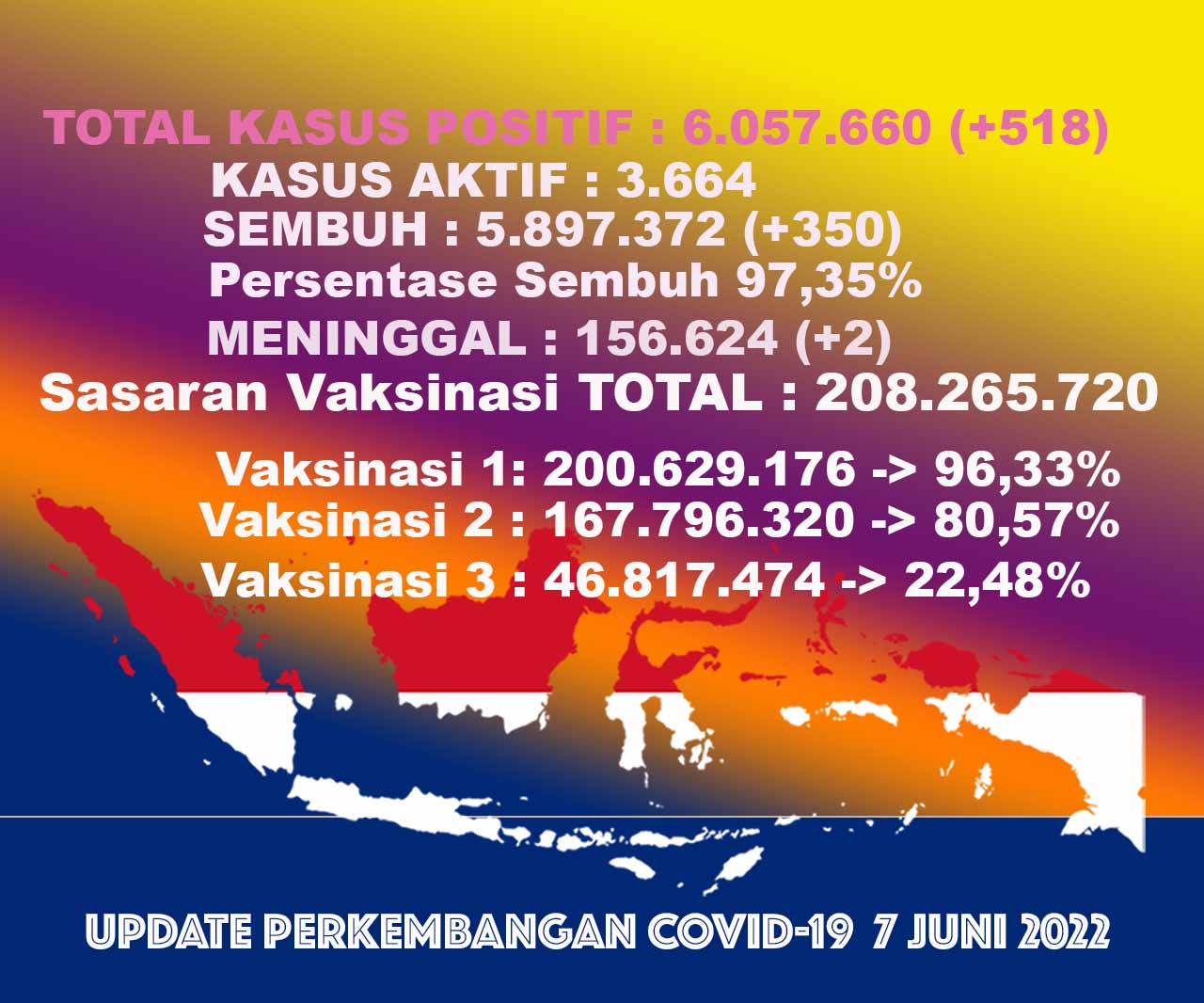(Vibizmedia – Nasional) Berikut adalah angka akumulatif perkembangan data kasus Covid-19 dari seluruh Indonesia hingga tanggal 7 Juni 2022.