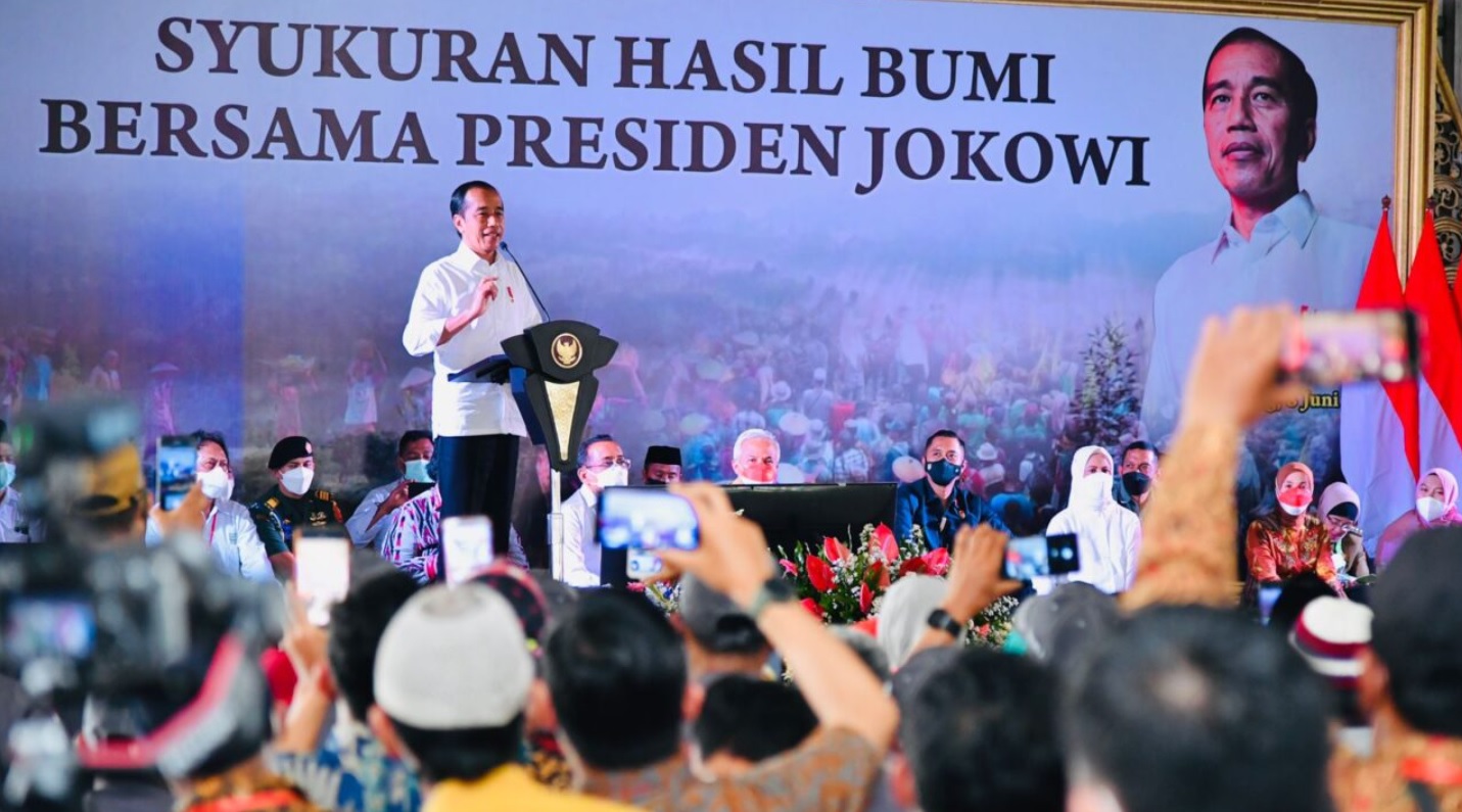 Presiden Joko Widodo menghadiri acara syukuran hasil bumi Gerakan Masyarakat (Gema) Perhutanan Sosial yang digelar di Lapangan Omah Tani, Kabupaten Batang, Provinsi Jawa Tengah, pada Rabu, 8 Juni 2022. FOTO: BIRO PERS SETPRES