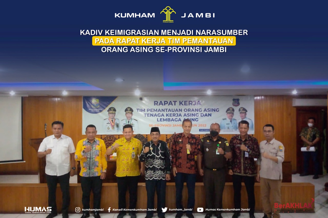 (Vibizmedia – Jambi) Kuala Tungkal -Kepala Divisi Keimigrasian Kantor Wilayah Kementerian Hukum dan HAM Jambi Amrizal menjadi narasumber pada kegiatan Rapat Kerja Tim Pemantauan Orang Asing, Tenaga Kerja Asing, dan Lembaga Asing se- Provinsi Jambi Tahun 2022 yang diselenggarakan oleh Badan Kesatuan Bangsa dan Politik Provinsi Jambi di Ruang Pola Kantor Bupati Tanjung Jabung Barat pada hari Kamis (16/06).