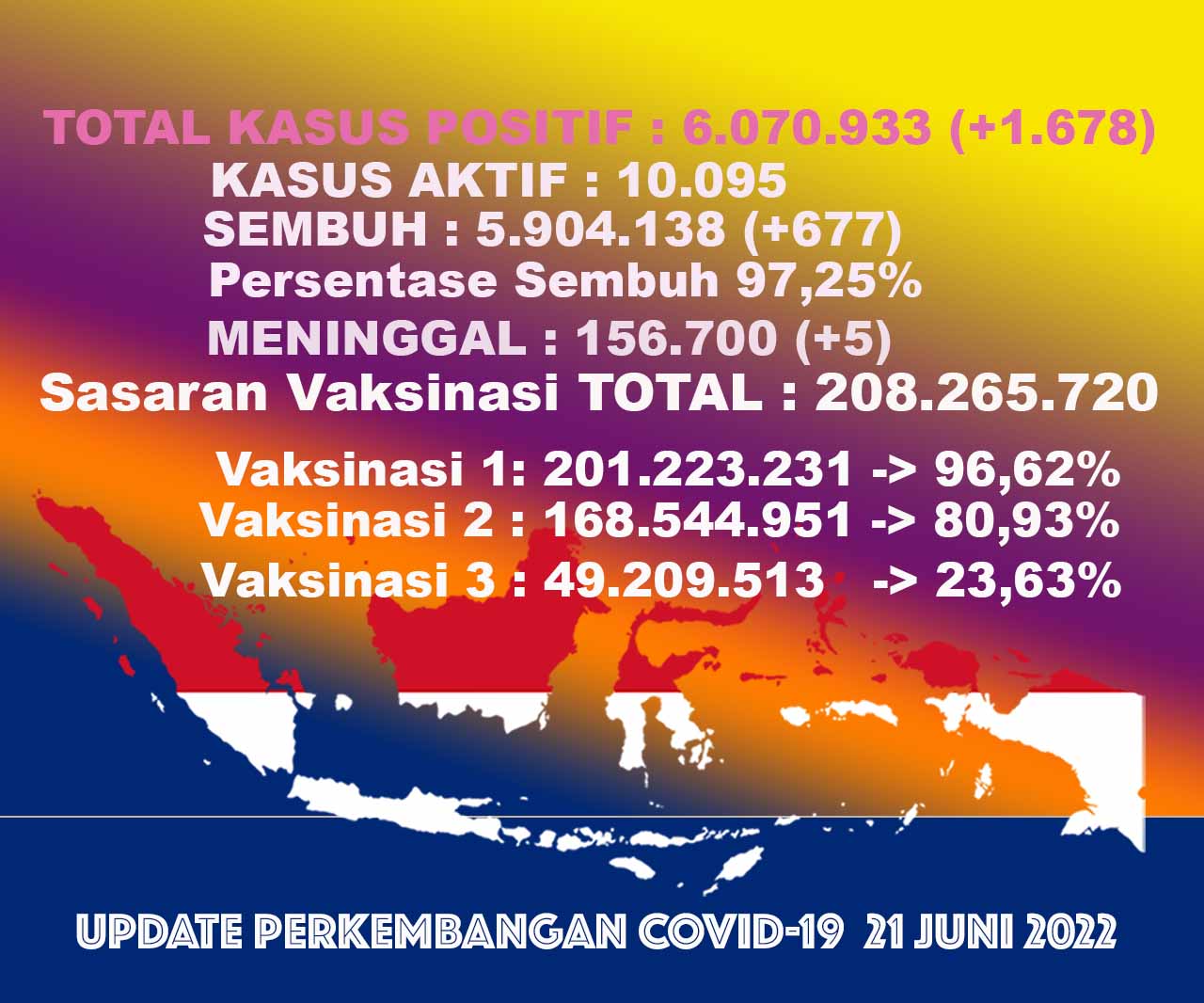 (Vibizmedia – Nasional) Berikut adalah angka akumulatif perkembangan data kasus Covid-19 dari seluruh Indonesia hingga tanggal 21 Juni 2022.