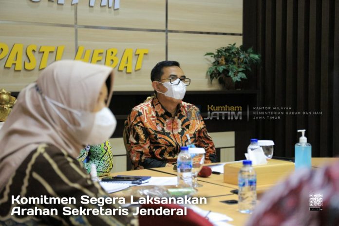 (Vibizmedia – Jatim) SURABAYA – Sekretaris Jenderal Kemenkumham Komjen Pol Andap Budhi Revianto memberikan arahan dan evaluasi pelaksanaan kinerja selama semester I 2022 hari ini (23/6). Kakanwil Kemenkumham Jatim Zaeroji menegaskan bahwa jajarannya siap melaksanakan arahan Sekjen.