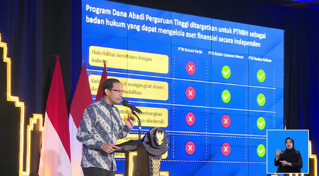 “Kemendikbudristek bekerja sama dengan LPDP menyediakan alokasi pendanaan dari Dana Abadi Perguruan Tinggi untuk menunjang Perguruan Tinggi Negeri Badan Hukum (PTNBH) menjadi perguruan tinggi kelas dunia. Kemendikbudristek dan LPDP akan melakukan pemadanan (matching) terhadap peningkatan dana abadi berupa dana pokok maupun investasi yang berhasil digalang,” kata Nadiem dalam sambutannya.