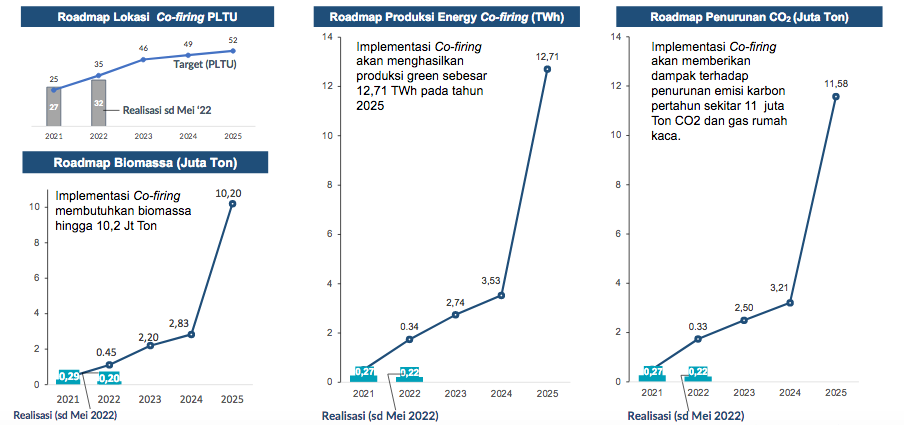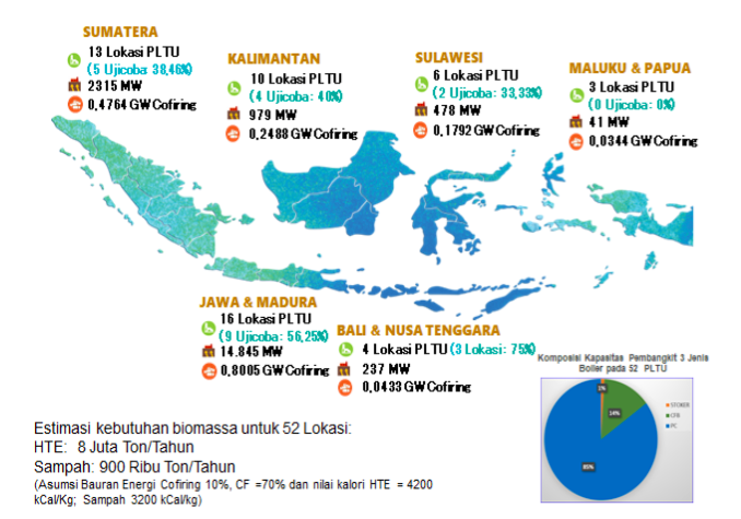 Apabila seluruh unit PLTU tersebut telah beroperasi co-firing secara komersial dengan persentase biomasa untuk PLTU boiler tipe PC sebesar 6%, CFB 40% dan Stoker 70%, maka dapat diperoleh kapasitas produksi EBT dari co-firing sebesar 2,7 GW yang membutuhkan biomasa hingga 14 juta ton per tahun (asumsi CF 70%).