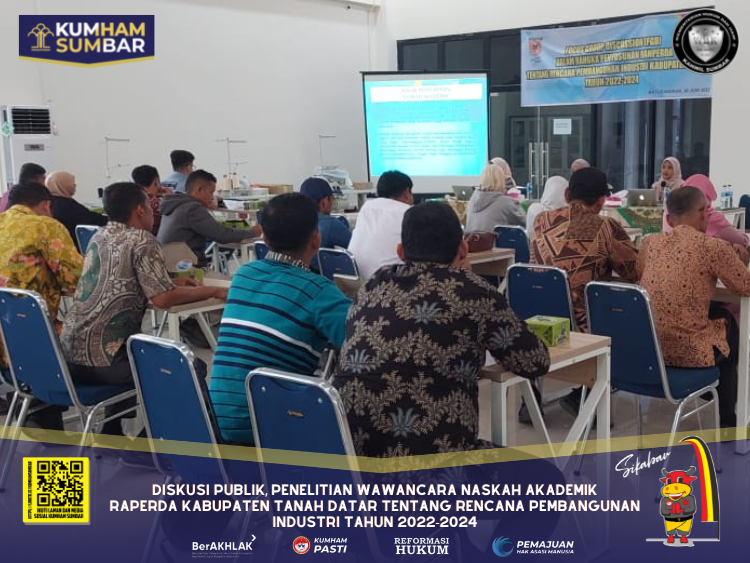 Kegiatan diskusi publik ini dilakukan dengan dua tahap dengan narasumber ibu Yeni Nel Ikhwan dari Kanwil Kemenkumham Sumbar. tahap pertama diskusi dilaksanakan dengan SKPD terkait dan seluruh camat yang ada di Kabupaten tanah datar. Selanjutnya pada tahapan kedua diskusi dilanjutkan dengan pelaku usaha industri yang ada di Kabupaten tanah datar dan wali nagari.