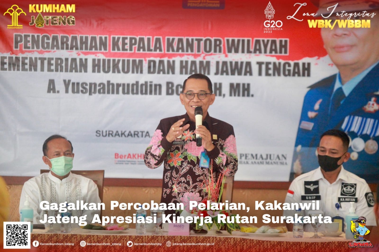 Dalam arahannya, Kakanwil mengapresiasi kinerja petugas Rutan Kelas 1 Surakarta dalam upaya penggagalan percobaan pelarian salah satu Warga Binaan Pemasyarakatan (WBP) yang terjadi beberapa hari yang lalu. Beliau juga menegaskan agar seluruh petugas harus memiliki komitmen yang sama dalam menjaga keamanan di Rutan.