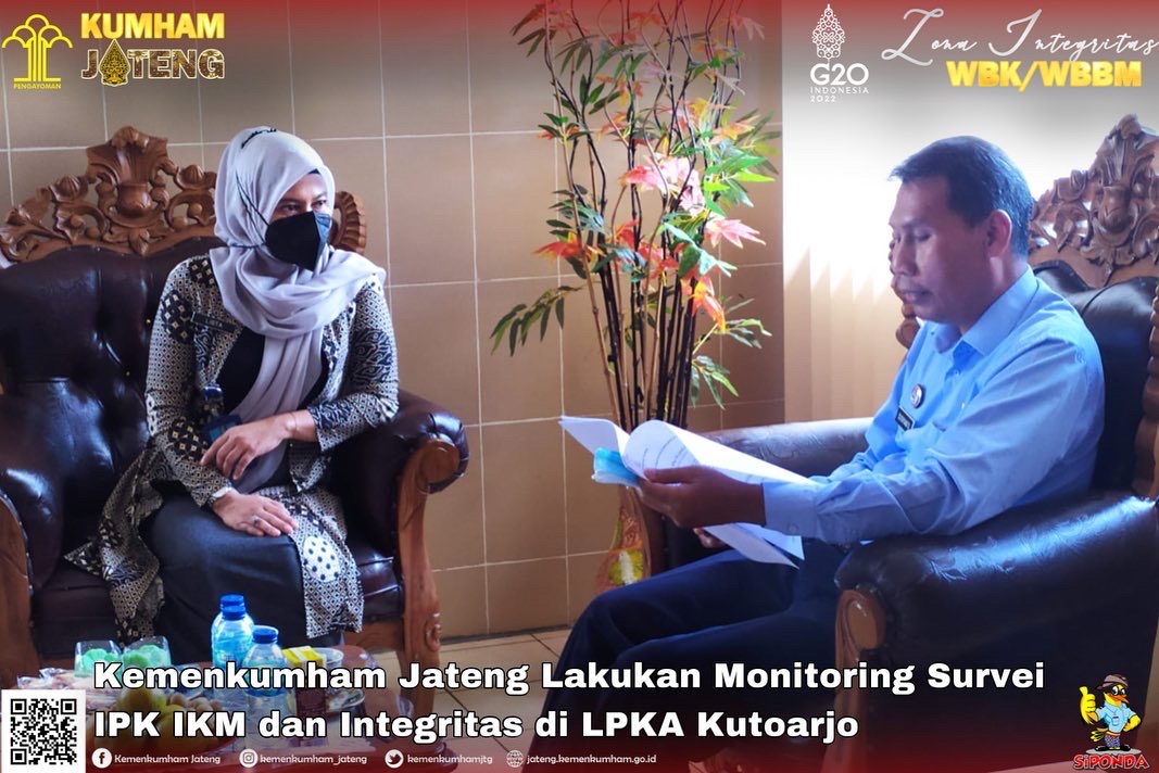 (Vibizmedia – Jateng) KUTOARJO – Kantor Wilayah Kementerian Hukum dan HAM Jawa Tengah melalui Bidang Hak Asasi Manusia, melaksanakan monitoring dan evaluasi Survei IPK IKM dan Survei Integritas Balitbang (3AS) di Lembaga Pembinaan Khusus Anak (LPKA) Kutoarjo, Kamis (07/07).Kepala Bidang HAM, Lista Widyastuti dan tim dalam melakukan monev survei IPK IKM dan survei integritas Balitbang (3AS) ke LPKA Kutuarjo diterima langsung oleh Kepala LPKA Kutuarjo Hari Winarca didampingi Sugiyanto Kasi Pengawasan dan Penegakkan Displin.