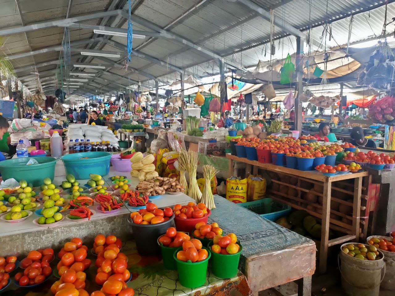 Warna-warni dagangan buah-buahan seperti tomat dan mentimun, dan berbagai sayuran serta rempah-rempah membuat suasana pasar tampak meriah.
