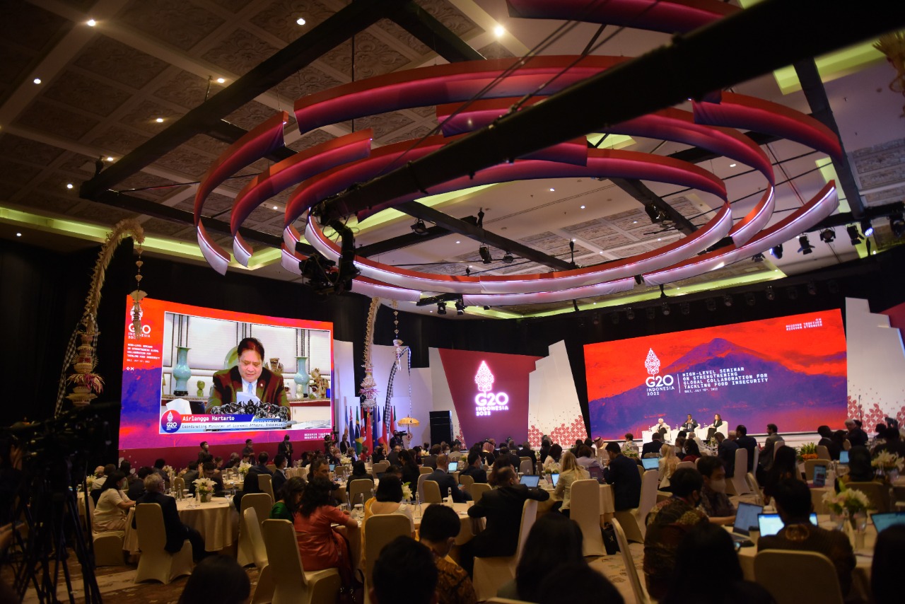 Secara virtual Menteri Koordinator Bidang Perekonomian Airlangga Hartarto hadir dalam G20 High Level Seminar yang bertajuk “Strenghtening Global Collaboration for Tackling Food Insecurity” di Bali, Jumat (15/07) dan menyampaikan bahwa negara-negara di dunia perlu mempercepat dan memperkuat kolaborasi global untuk mengatasi tantangan yang ada dalam ketahanan pangan. Untuk itu negara-negara G20 perlu berkomitmen bahu membahu memperkuat kolaborasi global untuk mengatasi tantangan ketahanan pangan global.