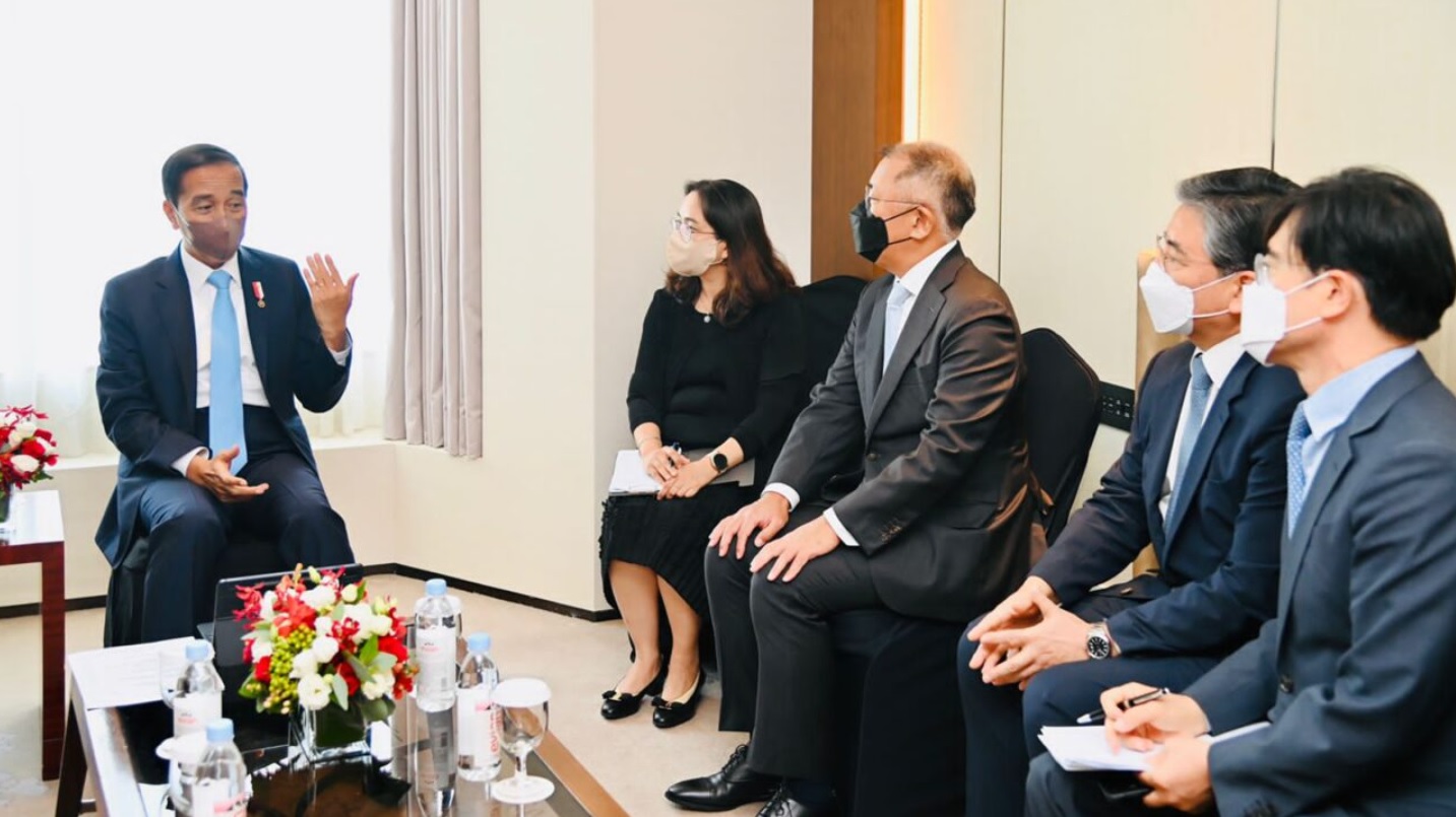 (Vibizmedia-Nasional) Presiden Joko Widodo menerima Executive Chairman Hyundai Motor Group, Chung Eui-sun, di Lotte Hotel, Seoul. Chairman Hyundai menyampaikan bahwa mereka akan melakukan ekspansi untuk mobil listrik serta penelitian dan pengembangannya di Indonesia, pada Kamis, 28 Juli 2022.