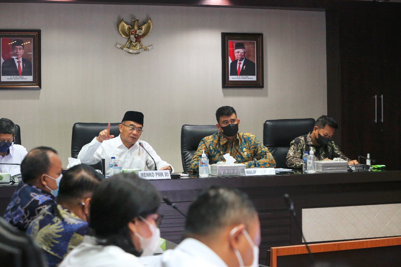 Menteri Koordinator Bidang Pembangunan Manusia dan Kebudayaan Muhadjir Rapat Koordinasi Percepatan Kantong Kemiskinan di Wilayah Belawan bersama Wali Kota Medan Bobby Nasution. FOTO: KEMENKO PMK