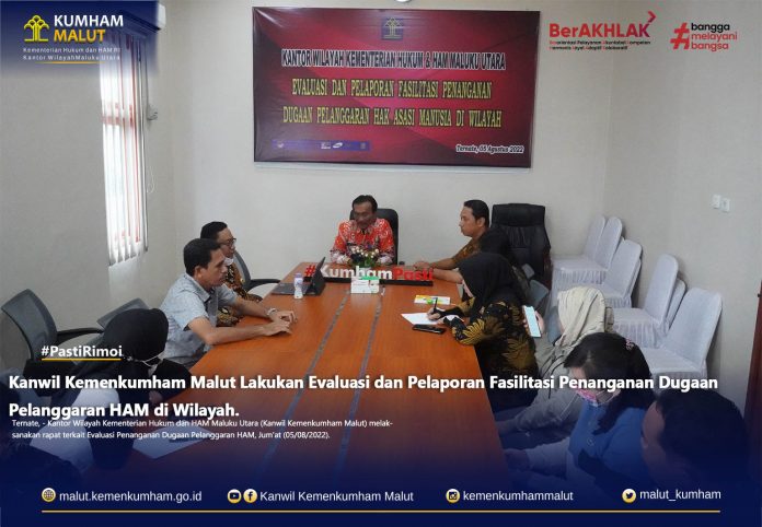 (Vibizmedia – Malut) Ternate, – Kantor Wilayah Kementerian Hukum dan HAM Maluku Utara (Kanwil Kemenkumham Malut) melaksanakan rapat terkait Evaluasi Penanganan Dugaan Pelanggaran HAM, Jum’at (05/08/2022).