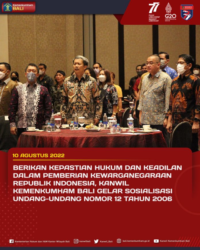 (Vibizmedia – Bali) BADUNG – Dalam rangka memberikan Kepastian Hukum dan Keadilan dalam Pemberian Kewarganegaraan Republik Indonesia, Kantor Wilayah Kementerian Hukum dan Hak Asasi Manusia Bali menggelar Sosialisasi Layanan Administrasi Hukum Umum Undang-Undang Nomor 12 Tahun 2006 Tentang Kewarganegaraan Republik Indonesia, Rabu 10 Agustus 2022 bertempat di The Trans Resort Bali. Hadir pada kesempatan tersebut, Direktur Jenderal Administrasi Hukum Umum Cahyo Rahadian Muzhar, Sekretaris Direktorat Jenderal Administrasi Hukum Umum Mohamad Aliamsyah, Direktur Tata Negara, Direktorat Jenderal Administrasi Hukum Umum Baroto, Kepala Divisi Pelayanan Hukum dan HAM Constantinus Kristomo, Pejabat Administrasi, Kepala Unit Pelaksana Teknis Keimigrasian se-wilayah Provinsi Bali, Perkumpulan Masyarakat Perkawinan Campuran Indonesia (PerCa Indonesia) Provinsi Bali serta JFT/JFU di Lingkungan Kantor Wilayah Kementerian Hukum dan Hak Asasi Manusia Bali.