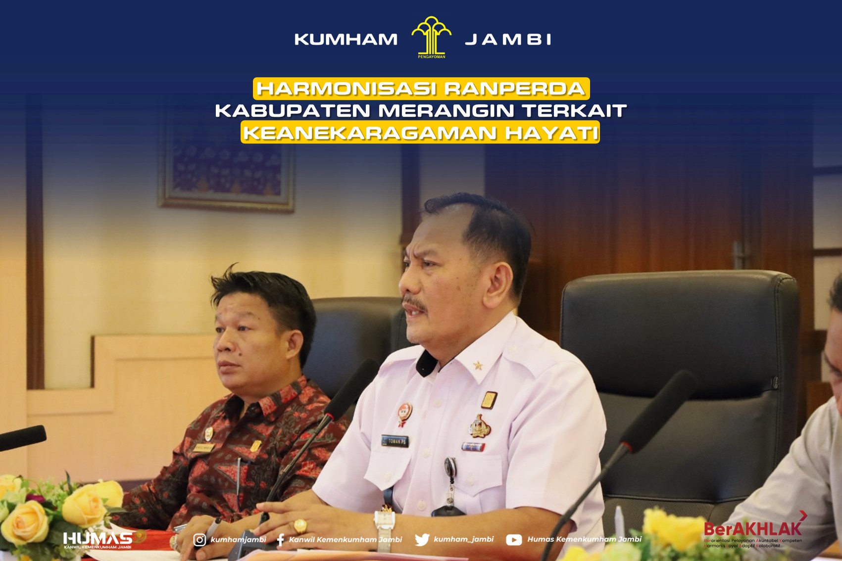 (Vibizmedia – Jambi) JAMBI – Kepala Divisi Pelayanan Hukum dan Hak Asasi Manusia (Kadivyankumham) Kantor Wilayah Kementerian Hukum dan Hak Asasi Manusia Jambi (Kanwil Kemenkumham Jambi) membuka kegiatan Harmonisasi Rancangan Peraturan Daerah (Ranperda) Kabupaten Merangin tentang Perlindungan dan Pengelolaan Keanekaragaman Hayati dengan didampingi oleh Kepala Bidang Hukum Suryo Widodo.