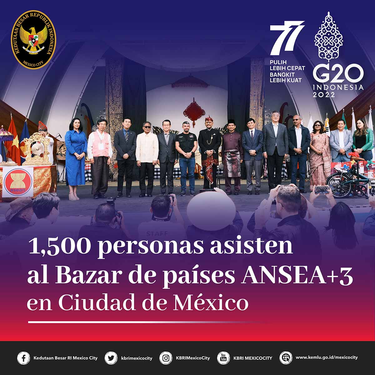 (Vibizmedia – Mexico City, Meksiko)  Pada Minggu (07/08/2022) lalu sejumlah  1.500 orang memenuhi Teatro Angela Peralta, Miguel Hidalgo, Mexico City, untuk menikmati dan meramaikan ASEAN+3 Bazaar yang diinisasi oleh Kedutaan Besar RI di Mexico City – sebagai ketua ASEAN Committee in Mexico City (ACMC) – dan diikuti oleh kedutaan besar negara anggota ASEAN dan negara mitra ASEAN (Tiongkok, Jepang dan Korea Selatan) di Meksiko. Bazaar tersebut diselenggarakan sekaligus untuk merayakan ulang tahun ke-55 ASEAN pada 8 Agustus 2022.