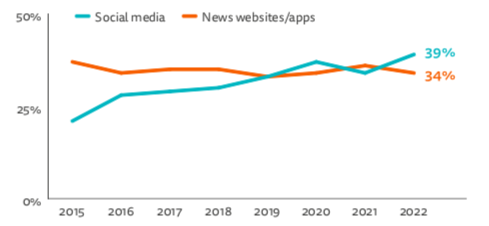 Sejak Digital News Report mulai melacak sumber berita utama responden, jejaring sosial terus menggantikan situs web berita sebagai sumber utama untuk khalayak yang lebih muda secara keseluruhan, dengan 39% anak muda (18-24) di seluruh pasar sekarang menggunakan sosial media sebagai sumber berita utama mereka, dibandingkan dengan 34% yang lebih memilih langsung ke situs web atau aplikasi berita.