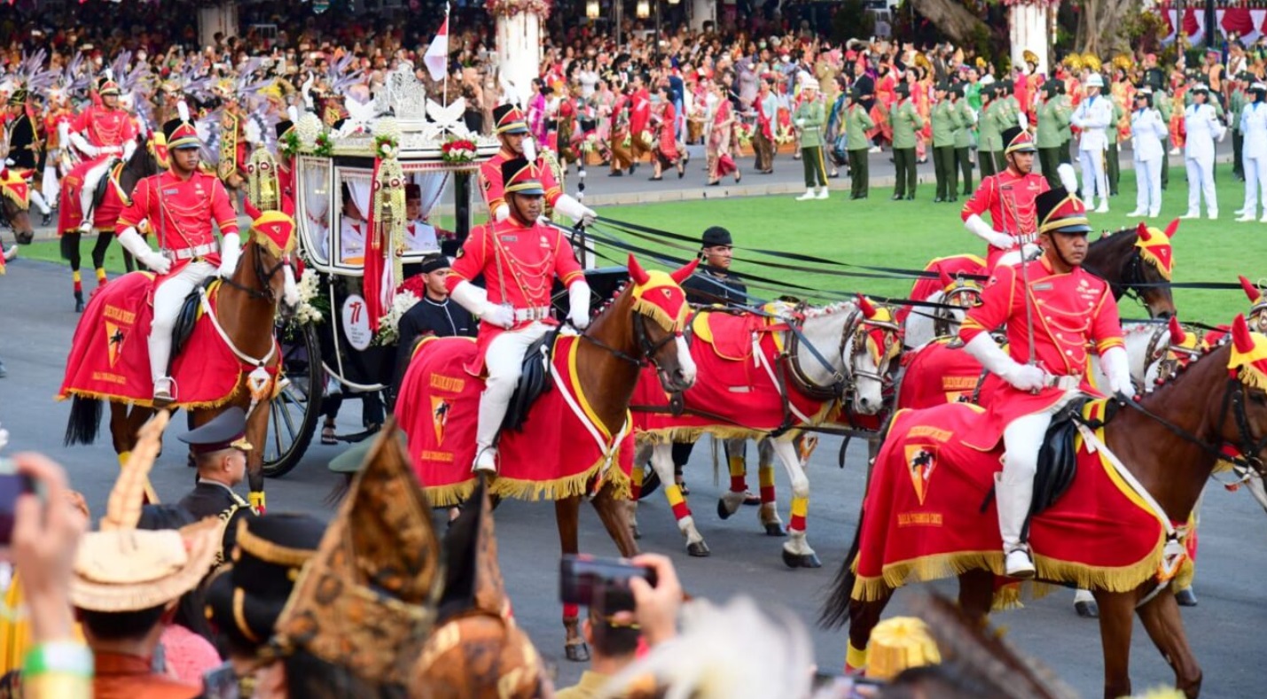 Kereta Kencana Ki Jaga Rasa yang membawa Purna Paskibraka Duta Pancasila pembawa duplikan bendera Merah Putih dan teks proklamasi bergerak menuju Monumen Nasional dengan diiringi kirab budaya dari Istana Merdeka, Jakarta, Rabu, 17 Agustus 2022. FOTO: BIRO PERS SETPRES