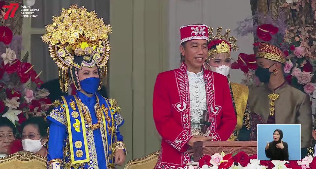 Kali ini, Presiden Jokowi mengenakan pakaian adat Dolomani dari Buton, Provinsi Sulawesi Tenggara. Sedangkan, Wakil Presiden Ma’ruf Amin beserta Ibu Wury Ma’ruf Amin memakai baju adat Provinsi Banten.