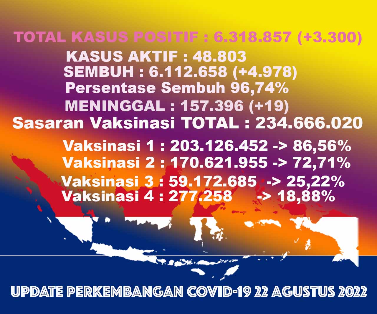 (Vibizmedia – Nasional) Berikut adalah angka akumulatif perkembangan data kasus Covid-19 dari seluruh Indonesia hingga tanggal 22 Augustus 2022.
