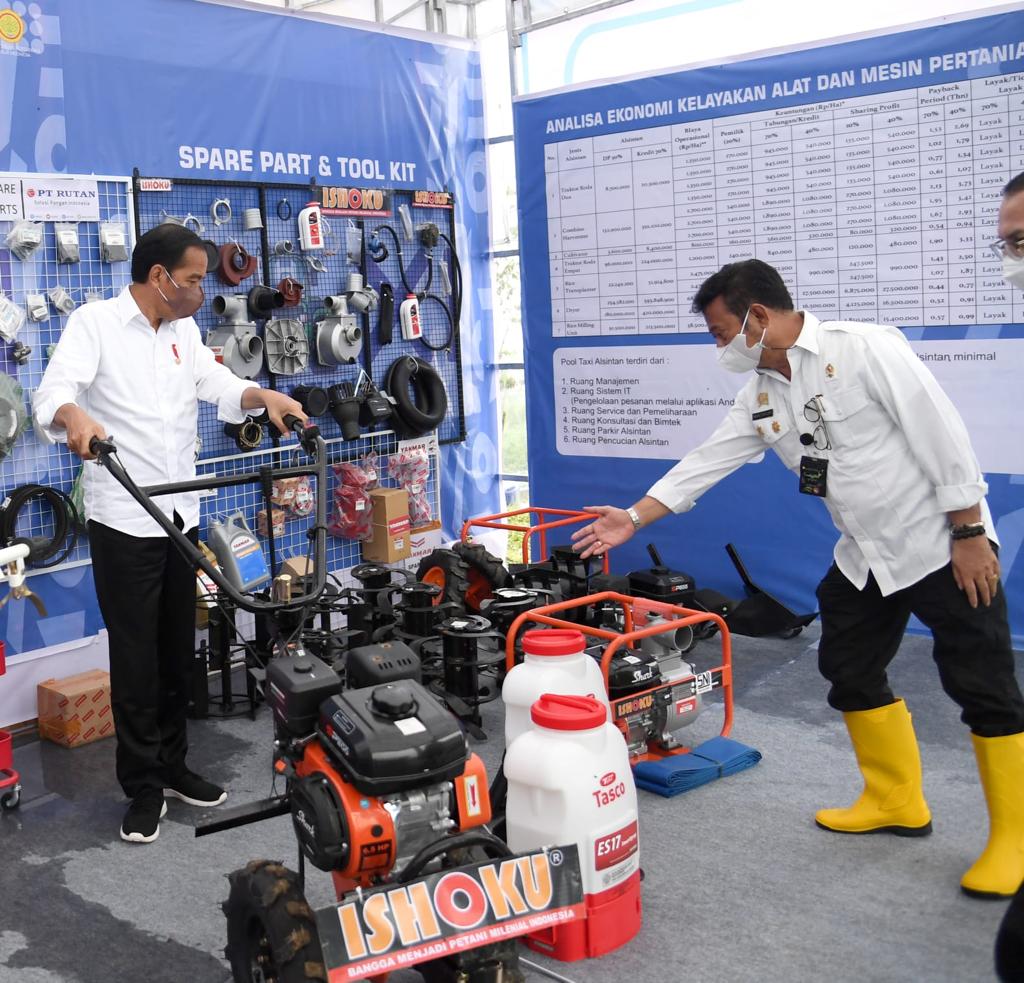 “Saya kira akan banyak sekali daerah-daerah, desa-desa, provinsi, kabupaten akan banyak para petani yang mau beli alat dan mesin pertanian baik itu apa rice mill unit (RMU), baik dryer, baik combine harvester, traktor dan lain-lain dengan pola taksi alsintan,” ujar Presiden.