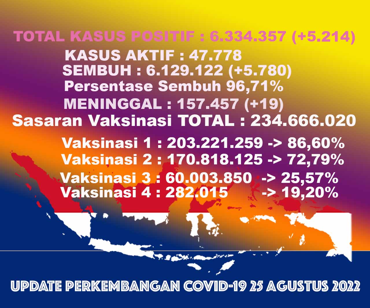 (Vibizmedia – Nasional) Berikut adalah angka akumulatif perkembangan data kasus Covid-19 dari seluruh Indonesia hingga tanggal 25 Augustus 2022.