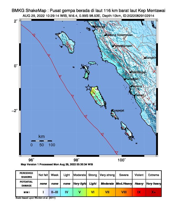 (Vibizmedia-Nasional) Badan Meteorologi Klimatologi dan Geofisika (BMKG) melaporkan gempabumi berkekuatan magnitudo (M) 6.4 terjadi di Kepulauan Mentawai, Sumatera Barat, Senin, 29 Agustus 2022 pukul 10.29 WIB. Pusat gempabumi itu diketahui berada di 0.99 LS, 98.53 BT atau 161 kilometer barat laut kepulauan mentawai pada kedalaman 10 kilometer.