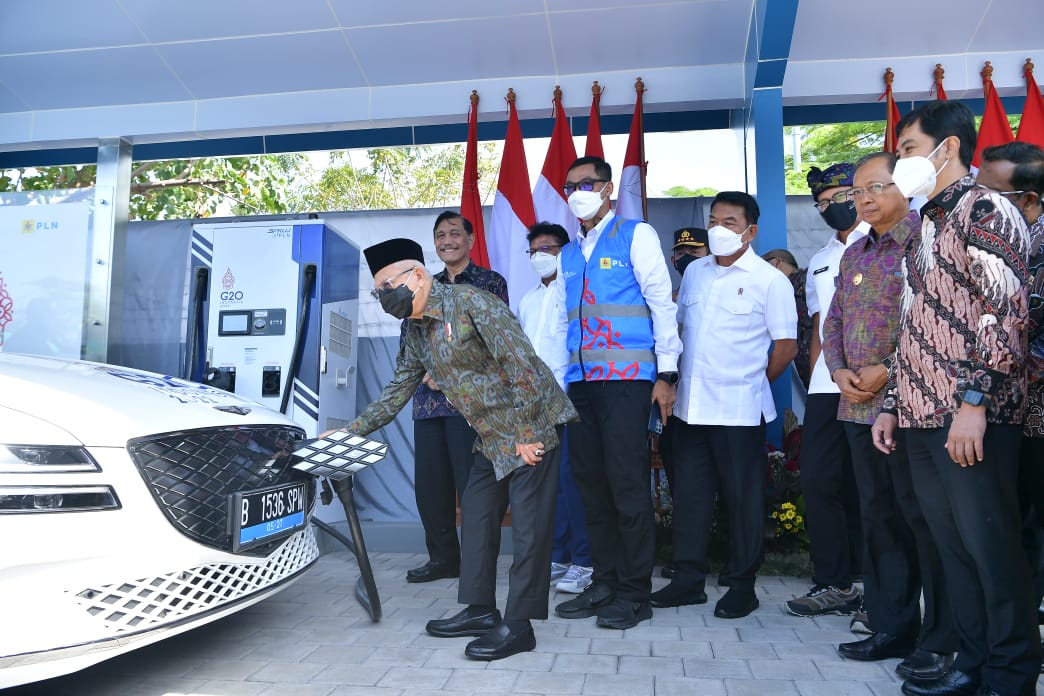 “Dimulai dari G20 di Bali, seperti Gubernur tadi menyampaikan bahwa fasilitas Stasiun Pengisian Kendaraan Listrik Umum (SPKLU) tidak akan dicabut (setelah KTT), tetapi diteruskan untuk memulai kehidupan yang baru di Bali. Dan ini menjadi awal daripada proses penggunaan mobil listrik di Indonesia,” ungkap Wapres saat memberikan keterangan pers usai meninjau SPKLU di area Hotel Apurva Kempinski, Jl. Raya Nusa Dua Selatan, Kabupaten Badung, Bali, Selasa (30/08/2022).