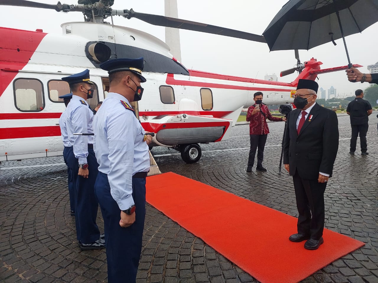 Menggunakan Helikopter VVIP Kepresidenan Super Puma TNI–AU, Wapres beserta rombongan lepas landas dari Helipad Monumen Nasional (Monas) menuju Lapangan Sepak Bola Idjon Jambi Pusat Pusdiklatpassus pada pukul 07.45 WIB.