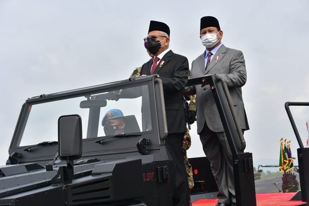 Wakil Presiden Republik Indonesia K. H. Ma'ruf Amin didampingi Menteri Pertahanan Prabowo Subianto, menjadi Inspektur Upacara Penetapan Komponen Cadangan TNI, Kamis (8/9) di Lapangan Terbang Suparlan, Pusat Pendidikan dan Latihan Pasukan Khusus (Pusdiklatpassus) Kopassus, Batujajar, Bandung, Jawa Barat. (Foto: BPMI Setwapres)
