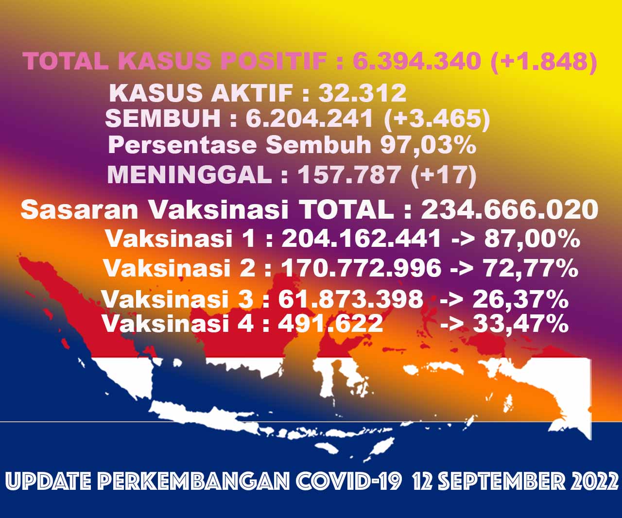 (Vibizmedia – Nasional) Berikut adalah angka akumulatif perkembangan data kasus Covid-19 dari seluruh Indonesia hingga tanggal 12 September 2022.