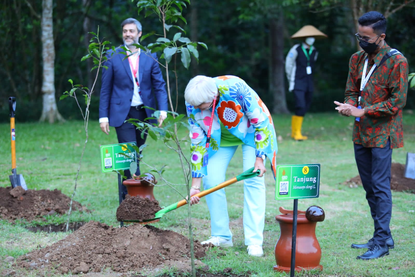 Para delegasi G20 yang terlibat dalam penanaman pohon ini nampak berantusias menanam benih pohon menggunakan sekop dan diilanjutkan dengan penyiraman air menggunakan gayung dari batok kelapa.