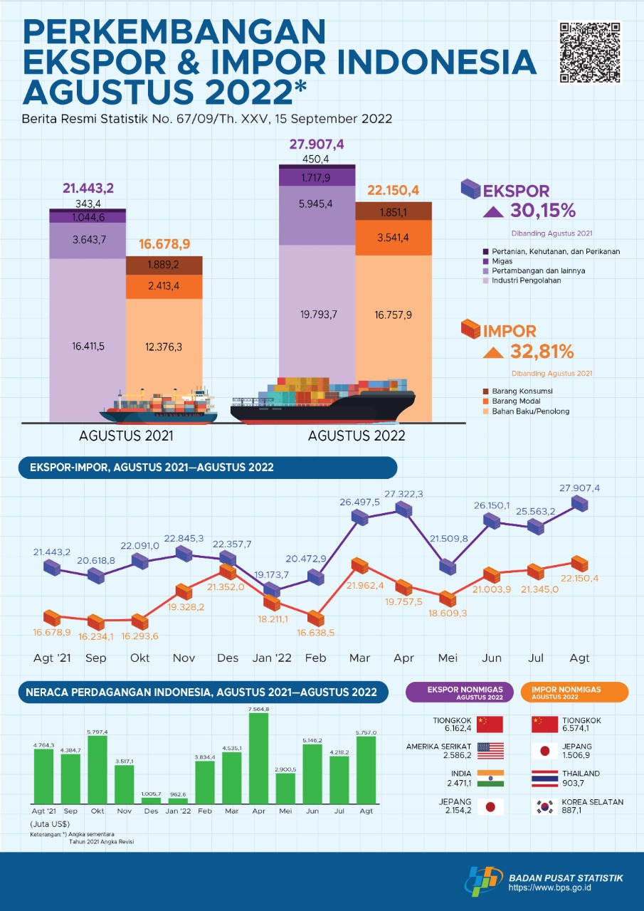 Nilai ekspor Indonesia Agustus 2022 mencapai US$27,91 miliar atau naik 9,17 persen dibanding ekspor Juli 2022. Dibanding Agustus 2021 nilai ekspor naik sebesar 30,15 persen.