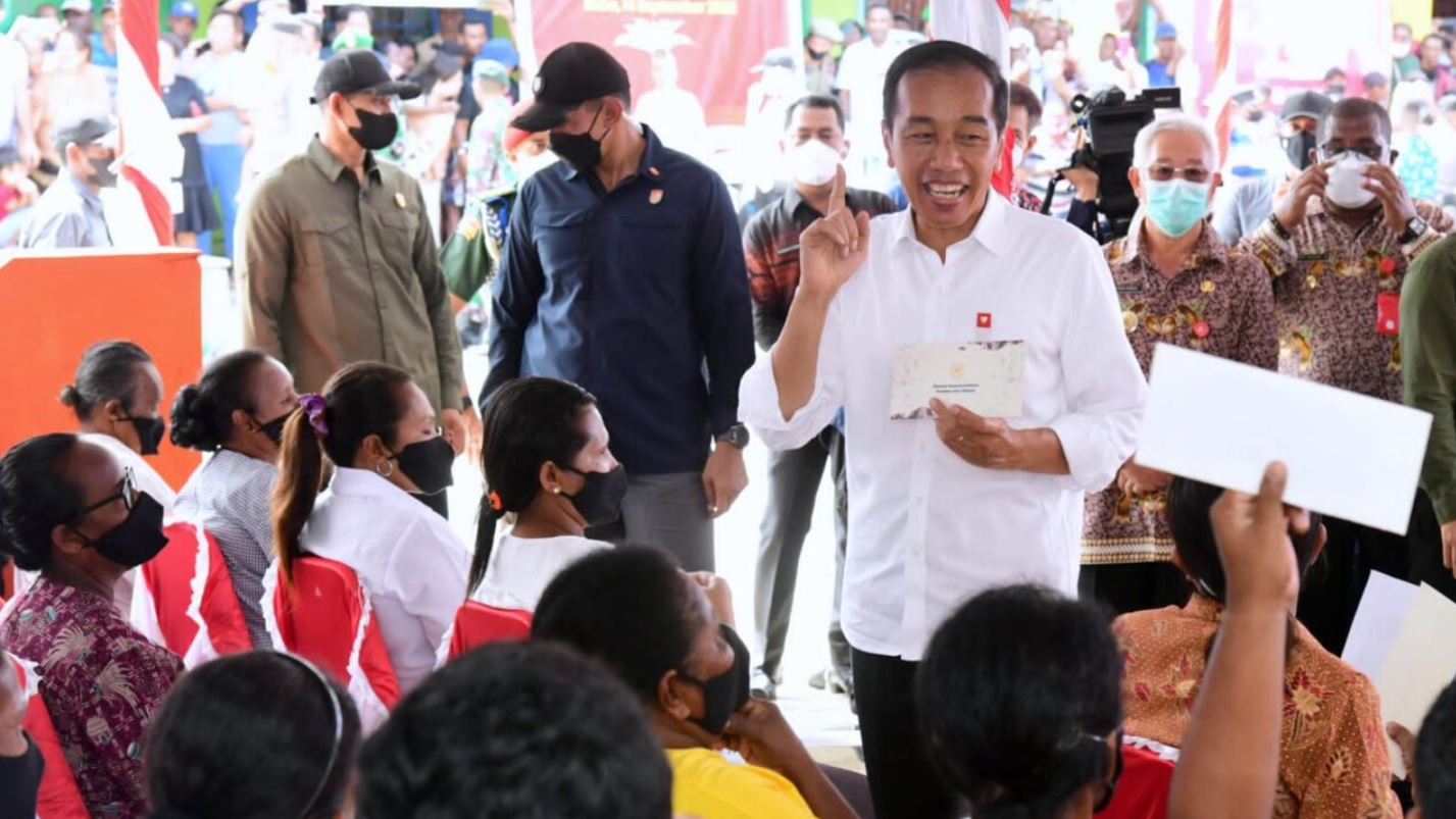 (Vibizmedia-Nasional) Presiden Joko Widodo dan Ibu Iriana Joko Widodo meninjau penyerahan bantuan sosial berupa bantuan langsung tunai (BLT) bahan bakar minyak (BBM) di Kantor Pos Dobo, Kabupaten Kepulauan Aru, pada Kamis, 15 September 2022.