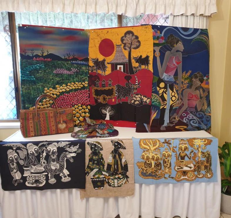 Ibu Isti Monfries, pencinta seni yang sudah 52 tahun tinggal di Canberra namun tetap semangat melestarikan budaya Indonesia kemudian memandu diskusi dalam kegiatan yang juga memamerkan koleksi kain batik tulis dan lukisan batik hasil karya beliau.