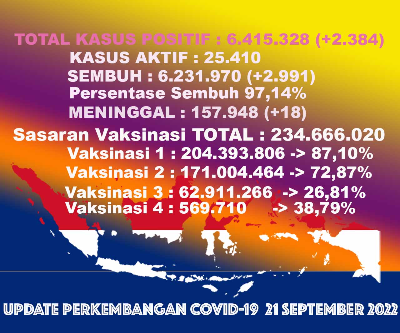 (Vibizmedia – Nasional) Berikut adalah angka akumulatif perkembangan data kasus Covid-19 dari seluruh Indonesia hingga tanggal 21 September 2022.