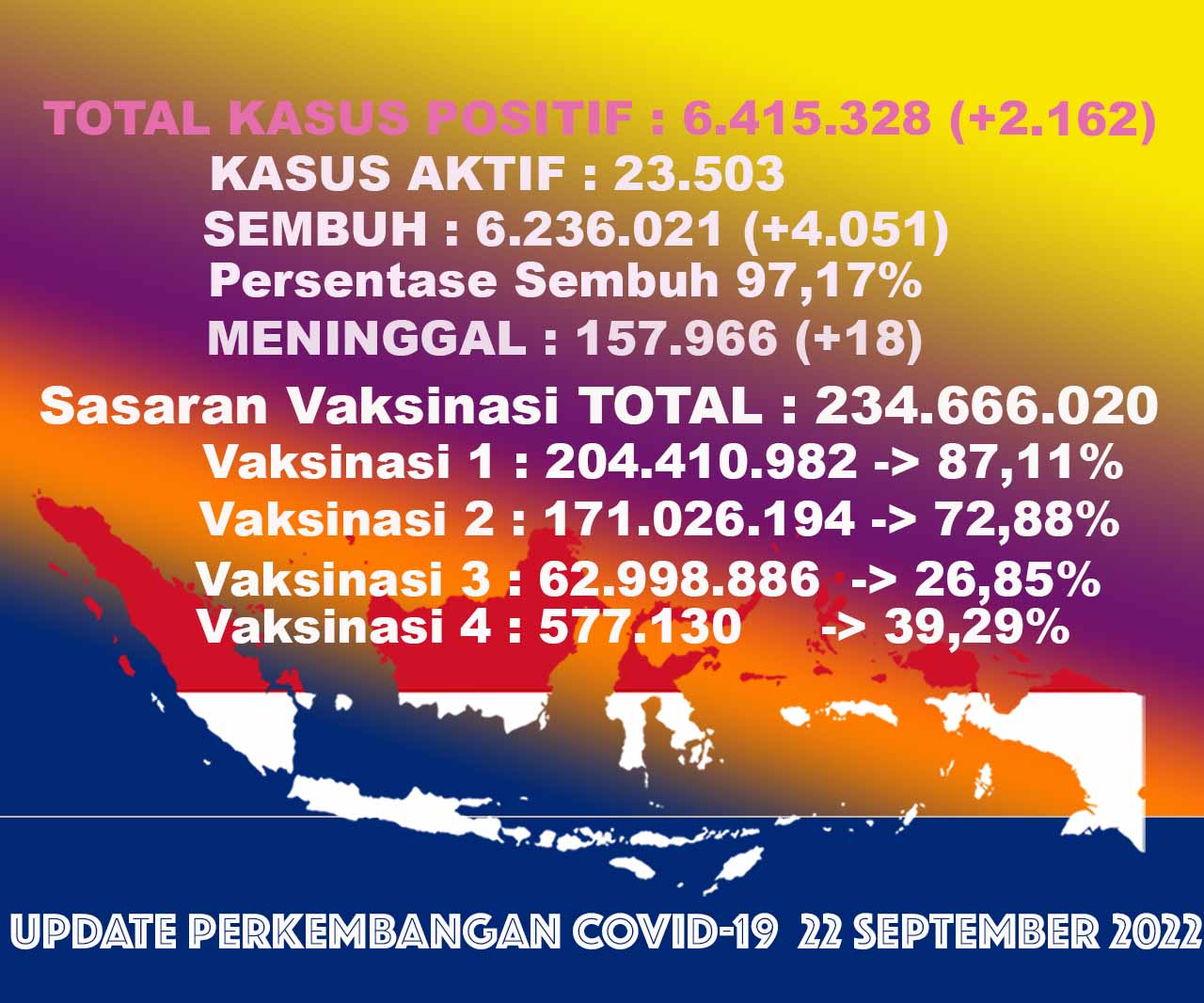 (Vibizmedia – Nasional) Berikut adalah angka akumulatif perkembangan data kasus Covid-19 dari seluruh Indonesia hingga tanggal 22 September 2022.