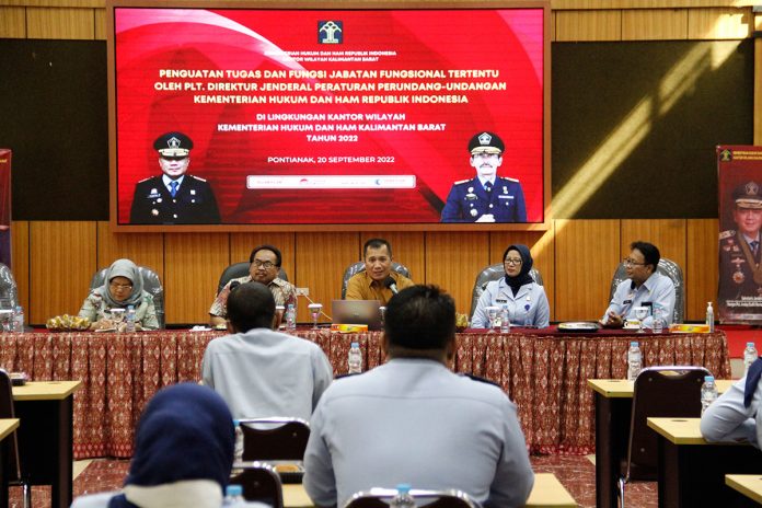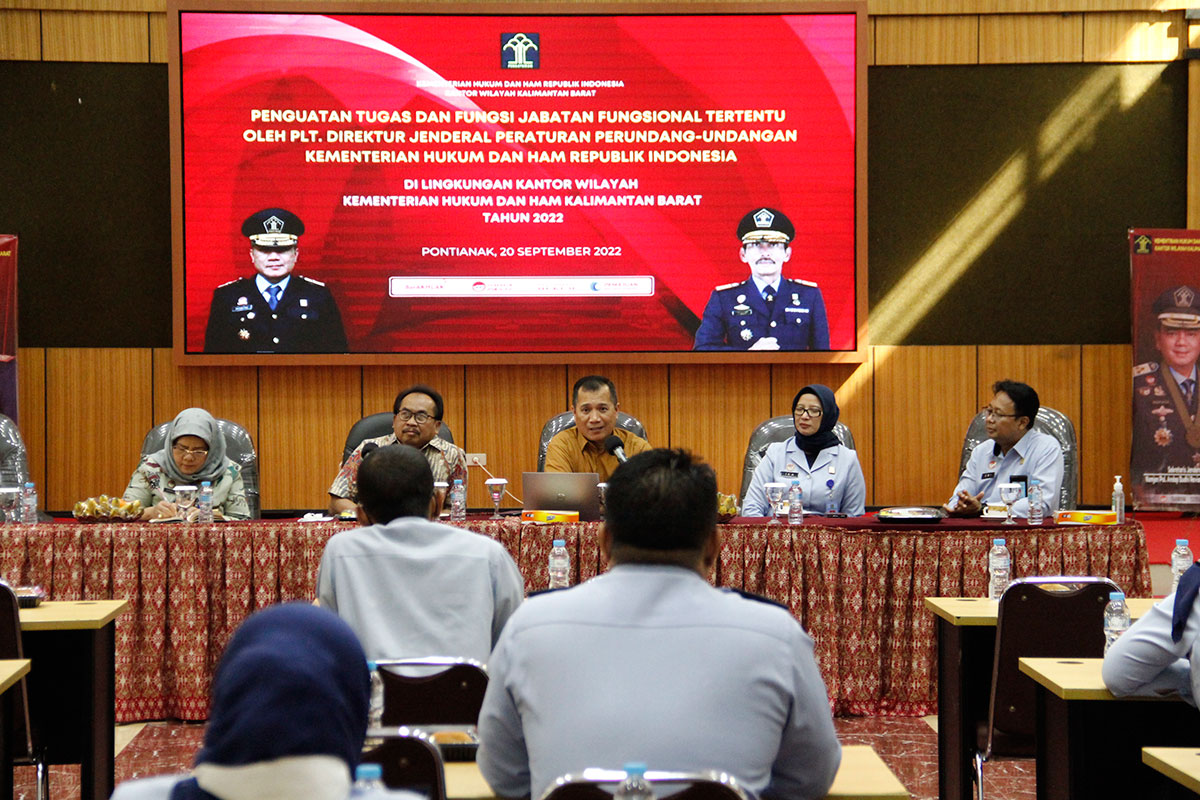 Plt. Direktur Jenderal Peraturan Perundang-undangan Dr. Dhahana Putra, Bc.IP, S.H., M.Si, setelah sebelumnya menjadi narasumber kegiatan Dialog Publik RUU KUHP yang dilaksanakan di Hotel Mercure Pontianak, berkesempatan memberikan Penguatan Tugas dan Fungsi Jabatan Fungsional Tertentu (JFT) Perancang Peraturan Perundang-undangan yang ada di Kantor Wilayah Kementerian Hukum dan Hak Asasi Manusia Kalimantan Barat pada Selasa (20/9).