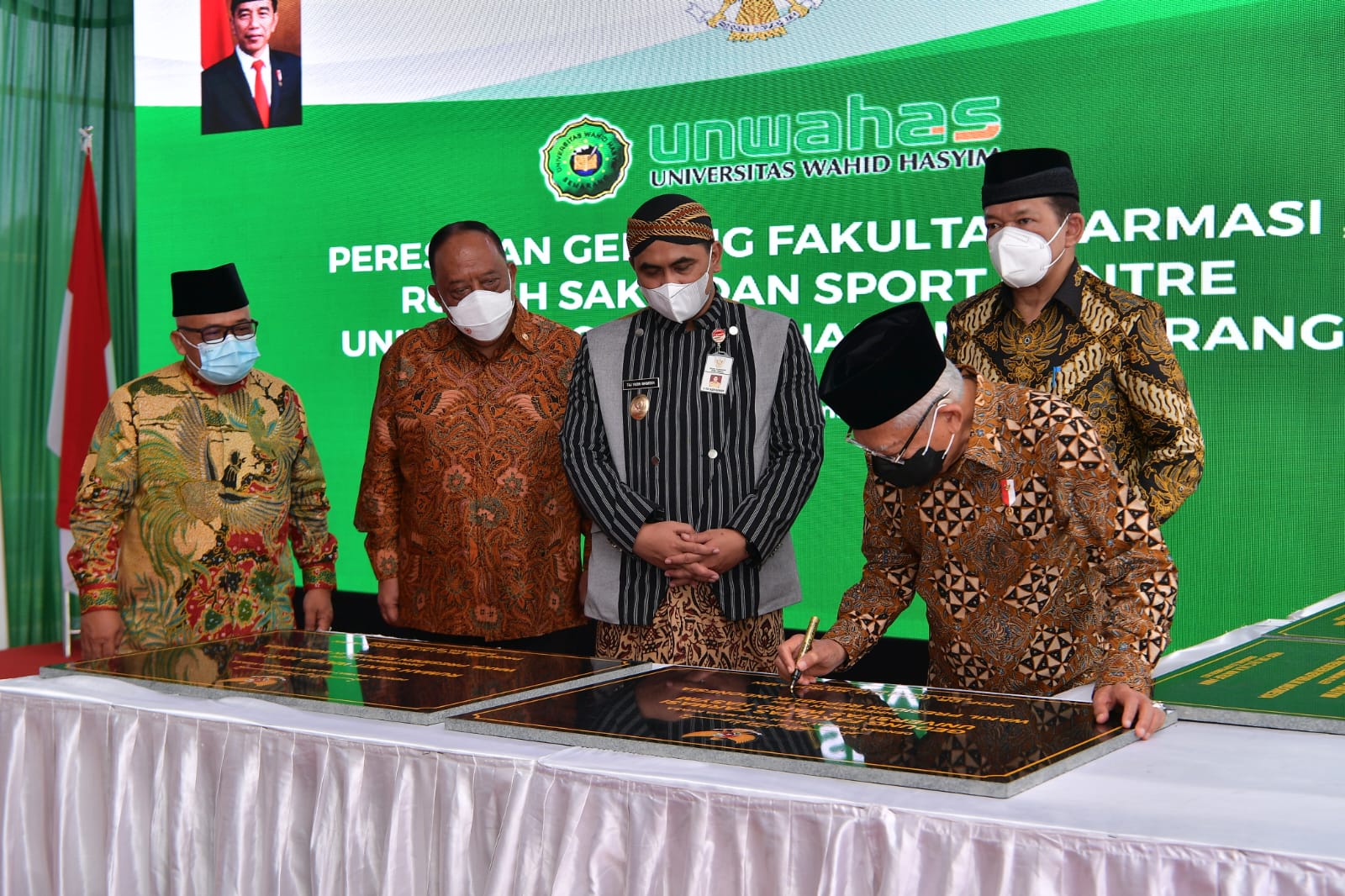 “Dengan mengucap Bismillahirahmanirrahim, Gedung Farmasi, Rumah Sakit, dan Sport Center Universitas Wahid Hasyim Semarang saya nyatakan diresmikan. Semoga Allah SWT senantiasa memberikan inayah-Nya dan meridai setiap ikhtiar yang kita lakukan,” pungkasnya.